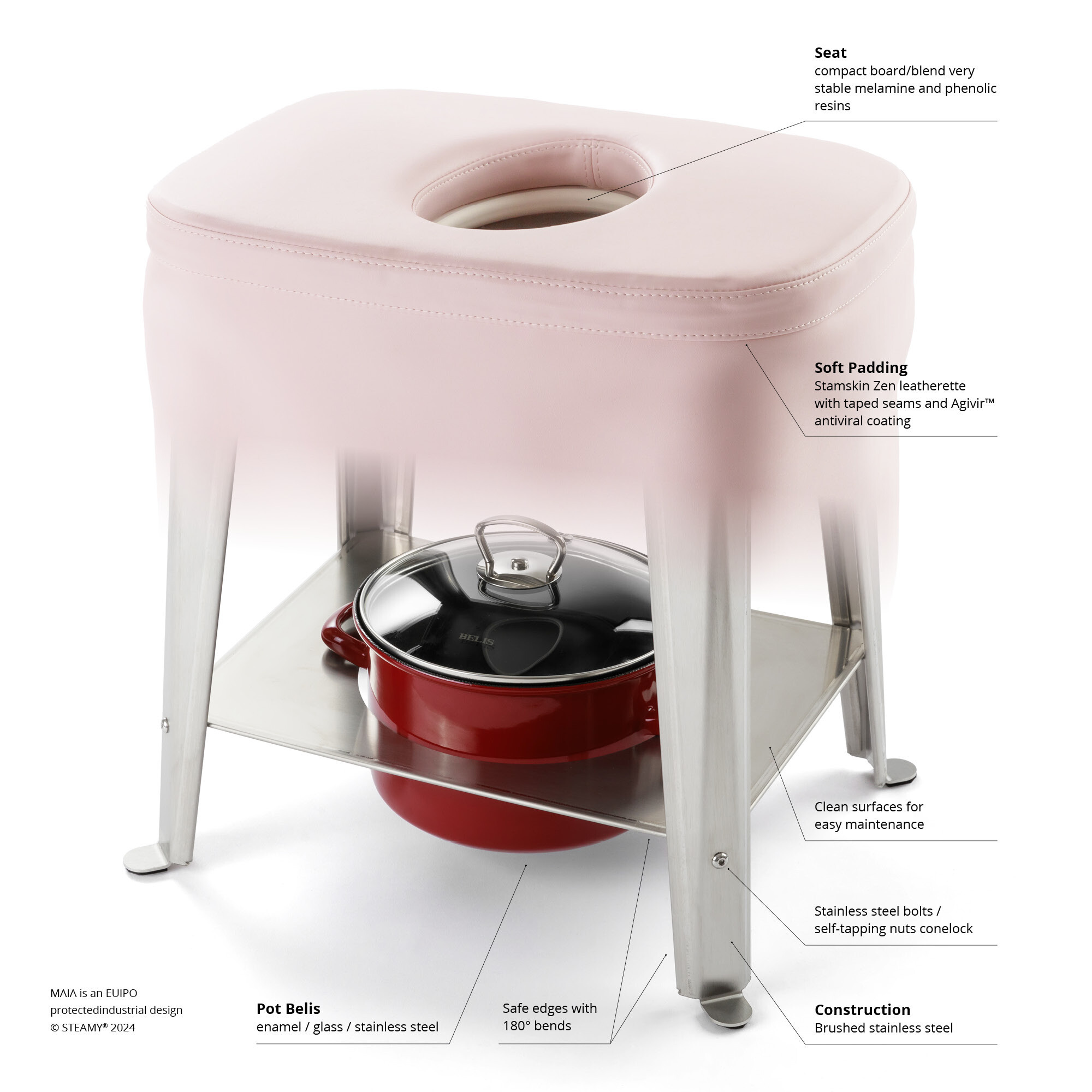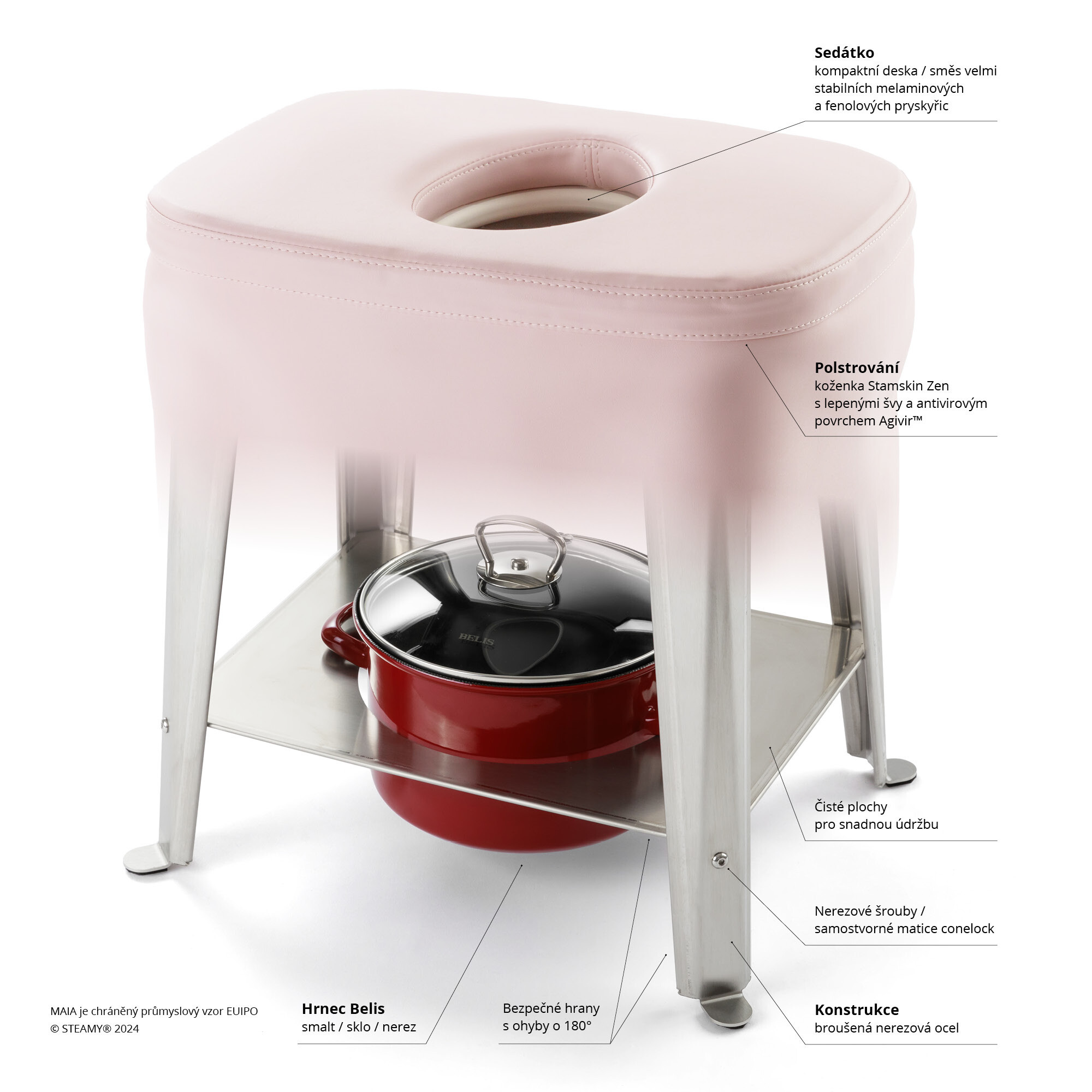 Steamy® MAIA Set pro ženskou bylinnou napářku je výsledkem sedmiletého vývoje pomůcek pro ženskou bylinnou napářku. Obsahuje zcela novou židličku z nerezové oceli, polstrování s lepenými švy a hrnec. Maia Set přináší zcela nový rozměr funkčnosti, bezpečnosti, pohodlí a snadné obsluhy v prostředí s vysokou zátěží, jako jsou porodnice, IVF centra nebo jiná zařízení nabízející proceduru pánevního napařování jako součást terapie v rámci profesionální péče o ženu.